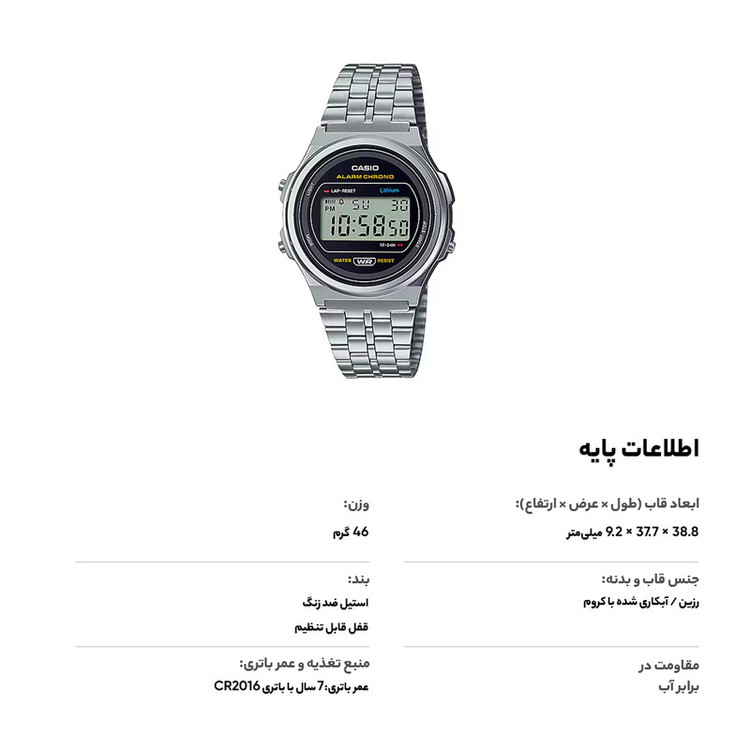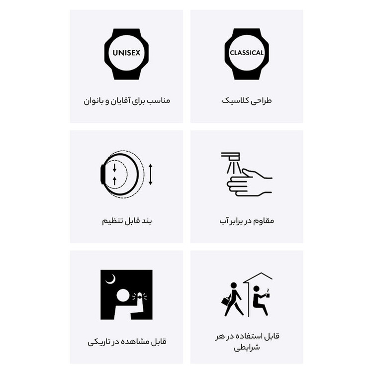 نمایش 24 ساعته , تاریخ شمار , نور پس زمینه , آلارم , کرنوگراف , ضد آب