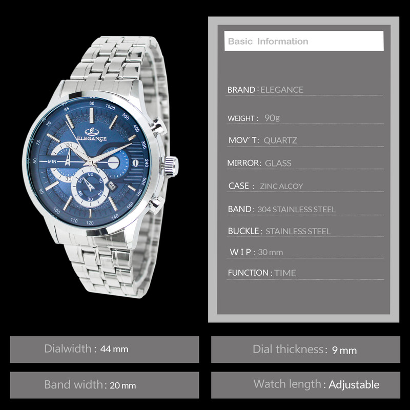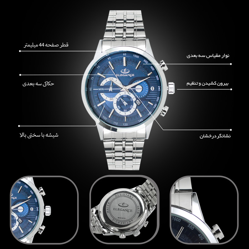ساعت مچی از گذشته تا حال یکی از محبوب ترین و پرطرفدار ترین اکسسوری های مردانه است و امروزه خریدارن به دنبال ساعت هایی هستند که زیبا و منحصر به فرد باشد. ساعت مچی مردانه الگانس یک برند ژاپنی معروف است که در زمینه ی تولید ساعت های باکیفیت و زیبا شناخته شده است که به دلیل داشتن ویژگی های فوق العاده و شیک به یکی از پرفروش ترین ساعت های جهان تبدیل شده است. این ساعت جزء ساعت های کلاسیک و آنالوگ محسوب می شود و مناسب برای آقایان خوشتیپ می باشد. ساعت مچی الگانس باتری بسیار قوی دارد و دارای بند استیل می باشد. بند استیل، اغلب محبوب ترین انتخاب برای آقایان است. صفحه ی ساعت این برند دارای شیشه با سختی بالا می باشد، همچنین قلب تپنده ی آن یعنی موتور ساعت، از نوع کوارتز است. به دلیل اقتصادی بودن این ساعت فقط موتور اصلی و تقویم آن کار میکند و سه موتور بقیه نمایشی هستند . این ساعت به شکل دایره طراحی شده است که دارای قطر 42 میلی متر و بی نهایت ظریف است . ساعت مچی آنالوگ به ساعت هایی می گویند که دارای اعداد و عقربه می باشند و از قدیم مورد استفاده قرار می گیرند. آقایانی که به استایل های کلاسیک و اصیل علاقه دارند برای خرید ساعت مردانه، ساعت های آنالوگ را انتخاب می کنند. این ساعت دارای موتور بسیار قوی و متریال حرفه ای و استیل بسیار با کیفیت و ضد زنگ می باشند که به استایل اصیل و کلاسیک شما، با طراحی های منحصر به فرد خود، جلوه ی بیشتری خواهد داد. ساعت مچی الگانس با دقت بالایی به انتخاب مواد اولیه و استفاده از تکنولوژی های پیشرفته پرداخته است و مدل های مختلف آن دارای عمق آب گیری مختلفی است که برخی از آن ها مناسب شنا غواصی هستند. این مدل ساعت مچی الگانس مردانه به صورت ضد آب طراحی شده است که آب داخل آن نفوذ نکند و قابلیت تحمل ناشی از فرو رفتن در درون آب را داشته باشد. با وجود این قابلیت دیگر نیازی نیست که در طول روز به دلایل مختلف از جمله شستن دست ها و انجام هر کاری که با آب ارتباط دارد، ساعت مچی خود را از دست باز کنید. ساعت الگانس جزء ساعتهای گران بازار است و همین نشان دهنده کیفیت بالا و متریال درجه یک است . شما می توانید با اطمینان خاطر، این نوع ساعت مچی را برای خود یا برای دوستان و نزدیکان خود خریداری کنید