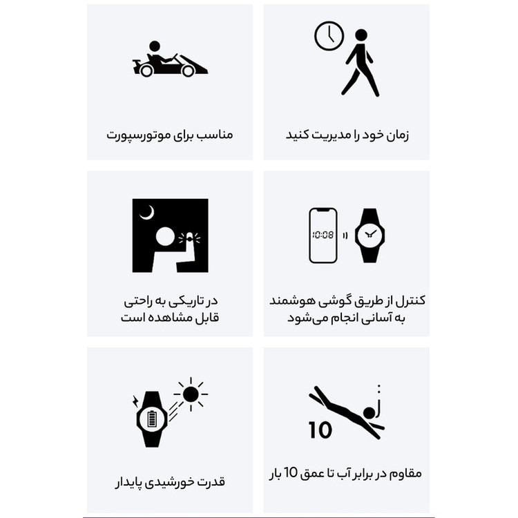 نمایش 24 ساعته , تاریخ شمار , نور پس زمینه , تایمر , آلارم