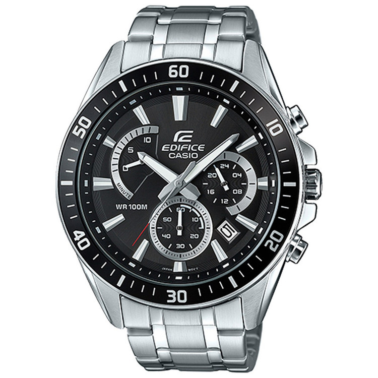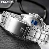 ساعت مچی عقربهای «کاسیو» مدل «Casio EFR-552D-1AVUDF» از ساعتهای شیک و جذاب مردانه از این برند ژاپنی است که در گروه ساعتهای «ادیفایس» (Edifice) دستهبندی میشود. این ساعت بندفلزی و کلاسیکاسپرت در طراحی خود از رنگ دوم مشکی بهره میبرد که در کنار بند و بدنهی نقرهای زیبایی قابلتوجهی را به همراه دارد. بر روی صفحهی مشکی این ساعت کرنوگراف، شاهد قابلیتهایی هستیم که مهمترین آنها همان زمانسنج و تاریخشمار است. تاریخشمار که شاید کارآمدترین قابلیت ساعتهای کلاسیک به نظر برسد، در این مدل بین نشانگر ساعت چهار و پنج تعبیه شده و شمارهی روز ماه را روی پسزمینهای سفید نمایش میدهد. علاوه بر دو شمارشگر مربوط به کرنوگراف یا زمانسنج که یکی از آنها به صورت نیمگرد (retrograde) طراحی شده، یک شمارشگر مربوط به نمایش 24 ساعته هم در سمت راست تعبیه شده که میتوان از آن برای تنظیم آسانتر تاریخشمار هم استفاده کرد. ساعت کاسیو مدل «EFR-552D-1AVUDF» با عرض تقریبی 47 میلیمتر در گروه ساعتهای صفحهبزرگ دستهبندی شده و طرح پرانتزی بالا و پایین قاب موجب میشود، ساعت روی مچ دست جلوهی جذابی داشته باشد. مقاومت بالای بدنه در برابر آب را میتوان از دیگر موارد مهم در طراحی این مدل اسپرت برشمرد. مقاومت تا فشار ده بار یا صد متر، موجب میشود تقریبا در تمام موقعیتهای روزمره نظیر شستوشوی دست یا بارش باران که ساعت برای لحظاتی در معرض آب قرار میگیرد، از نفوذ آب به بدنهی آن جلوگیری شود.