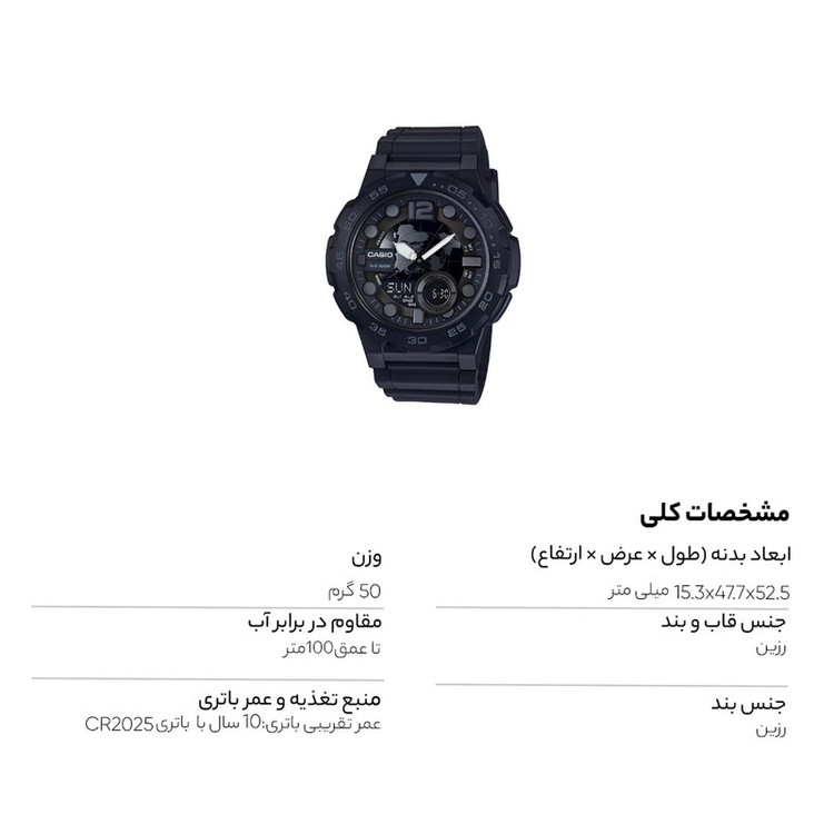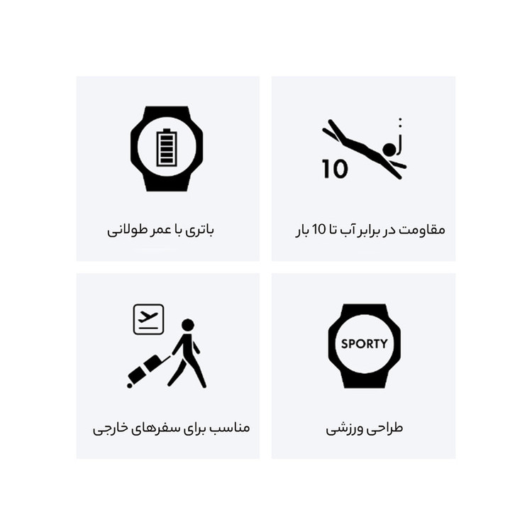 تایمر , عقربههای شبتاب , نمایش 24 ساعته , نور پس زمینه , تاریخ شمار , آلارم , کرنوگراف , ضد آب
