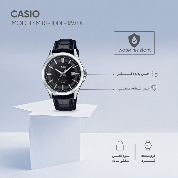 اگر شما هم جز آن دسته افرادی هستید که به داشتن ساعت علاقه دارید بهتر است در نظر داشته باشید که برای داشتن یک استایل منحصر به فرد ساعت میتواند یک گام درست باشد به شرط آنکه با استایل شما به درستی ست شود. ساعت مچی عقربه ای کاسیو مدل MTS-100L-1AVDF کاربرد روزمره دارد و به شما این اجازه را میدهد تا از آن به راحتی در هر روز با استایلهای مختلف استفاده کنید. جنس شیشه آن معدنی است و بند و بدنه آن از چرم تشکیل شده است. همچنین رنگ بند و بدنه این ساعت به ترتیب مشکی و نقره ای است. نوع قفل سگکی ساده محصول این اطمینان را میدهد که به راحتی با ضربه از دستمان نمیافتد. از دیگر ویژگیهای خوب این کالا میتوان به داشتن میزان 3 ATM مقاومت در برابر فشار آب اشاره کرد. پس اگر به دنبال ساعتی شیک برای خود یا هدیه برای دیگران هستید کاسیو انتخابی است که میتوانید آن را در نظر داشته باشید.