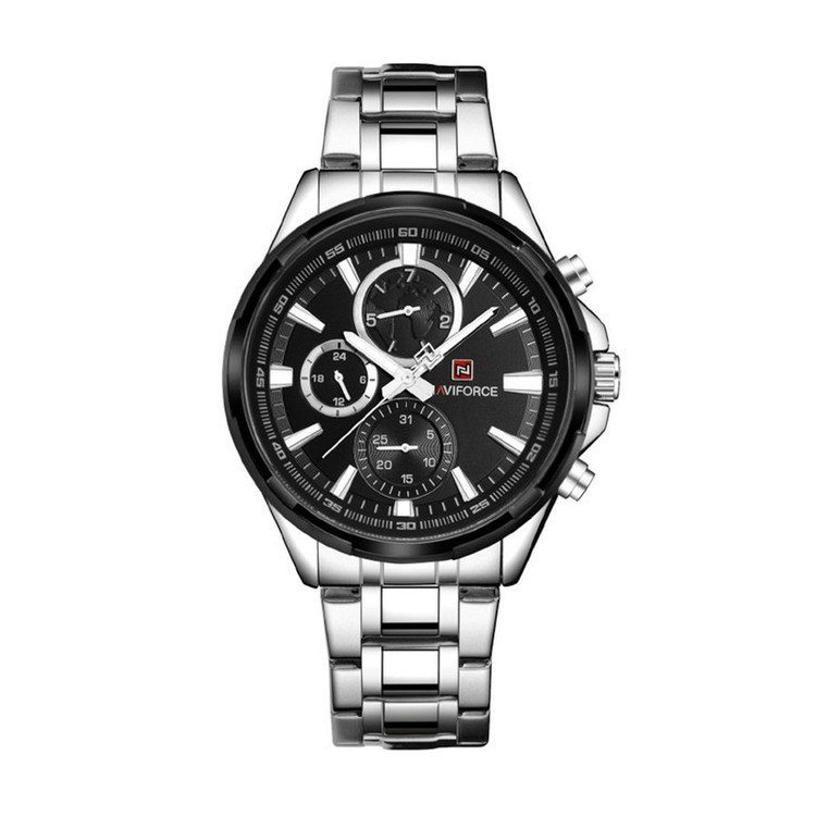 ساعت مچی مردانه نیوی فورس NAVIFORCE مدل NF9089 می باشد. کسانی که ساعت مچی اورجینال با قیمت مناسب و با دوام و کیفیت بالا می خواهند NAVIFORCE یک انتخاب عالی محسوب می شود. این ساعت با طراحی کلاسیک ، بند استیل میباشد. ساعت های نیوی فورس محصول اورجینال هستند که موتور کوارتز ساخت ژاپن با کیفیت عالی دارند. دارای بند استیل,ضد حساسیت و رنگ ثابت با شیشه معدنی مقاوم در برابر خش که در این چند سال خیلی توانسته در دل مردم جا باز کند. ساعت های نیوی فورس ظاهر جذاب و اسپرتی دارند.