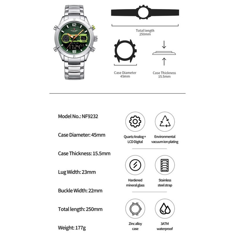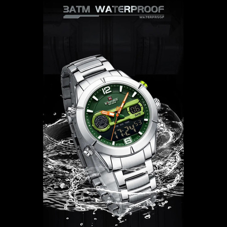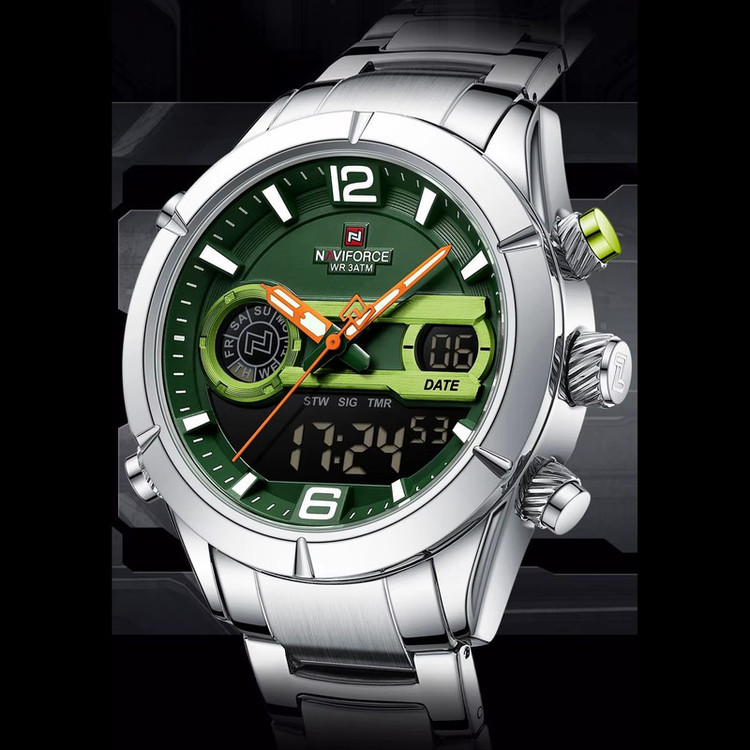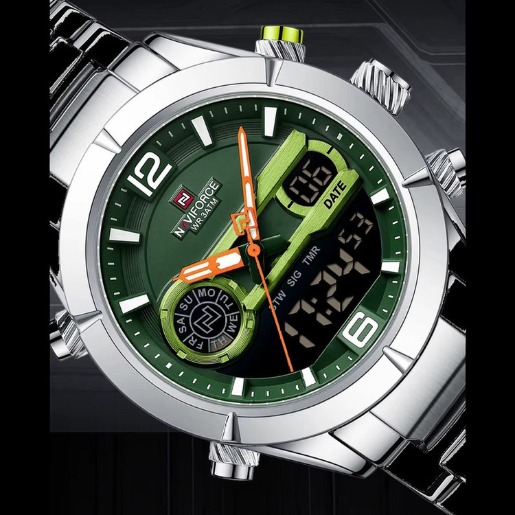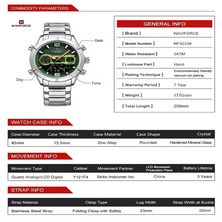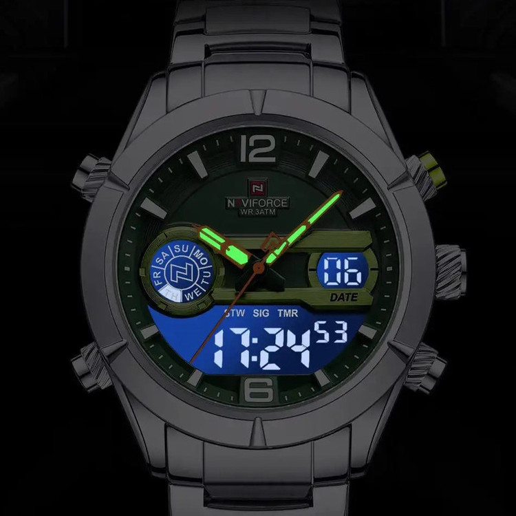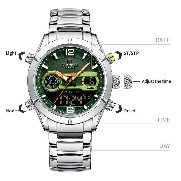 عقربههای شبتاب , نمایش 24 ساعته , نمایش ساعت دوم , نور پس زمینه , تایمر , تاریخ شمار , آلارم , شیشه ضدخش , کرنوگراف , ضد آب