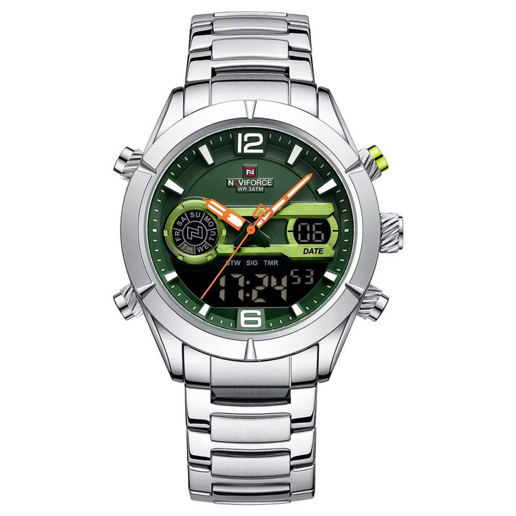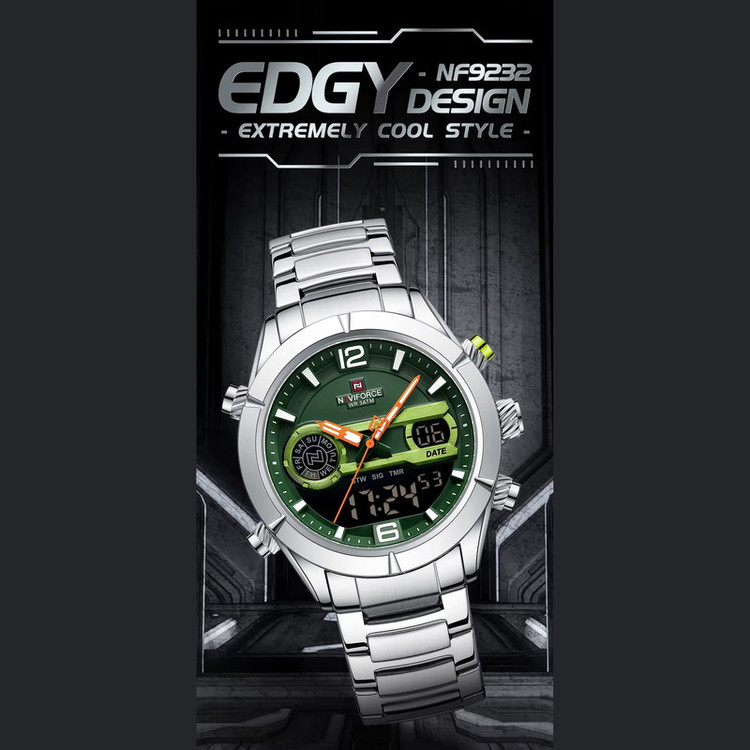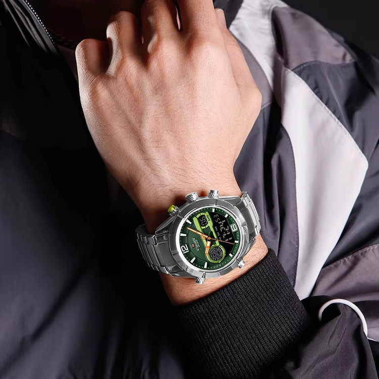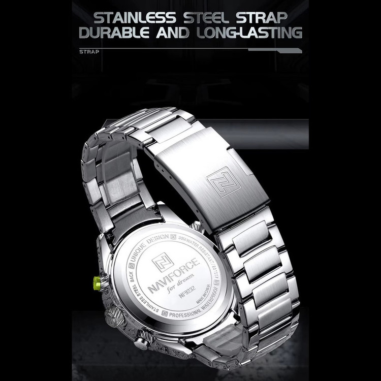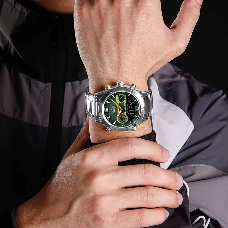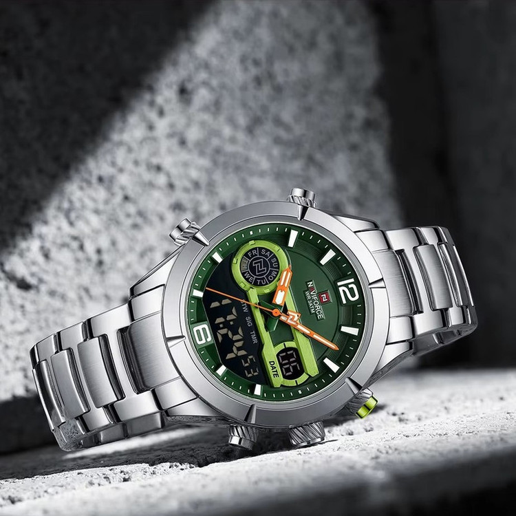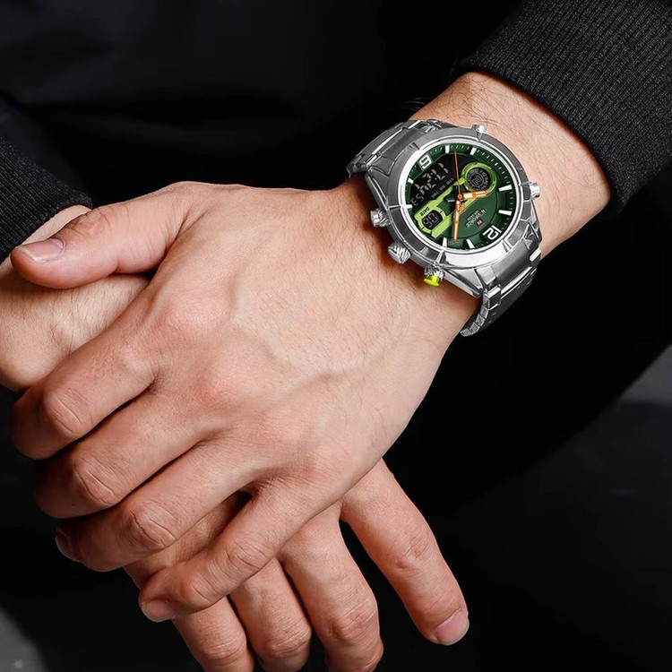 عقربههای شبتاب , نمایش 24 ساعته , نمایش ساعت دوم , نور پس زمینه , تایمر , تاریخ شمار , آلارم , شیشه ضدخش , کرنوگراف , ضد آب
