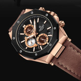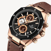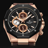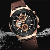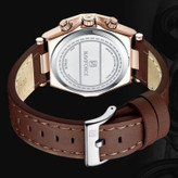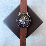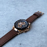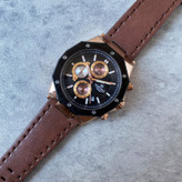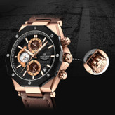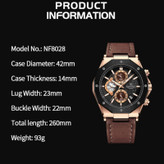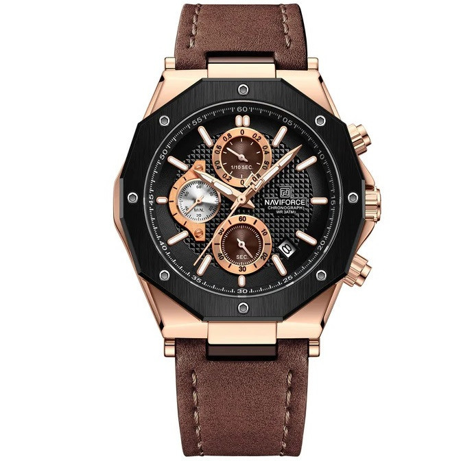 این مدل از ساعت مچی های مردانه برند نیوی فورس بر اساس سبک کلاسیک و اسپرت و روزمره بوده و دارای طراحی بسیار زیبایی می باشد.شیشه ی معدنی ضد خش و بند چرمی بسیار باکیفیت و بدنه ی این ساعت استیل رنگ ثابت بوده که از ترکیب رنگ های مشکی و قهوه ای و رزگلد در آن استفاده شده است و جزو ساعت های خوش فروش برند نیوی فورس است و جزو بهترین و مناسب ترین ایده ها برای کادوی مردانه در مناسبت های مختلف میباشد. طراحی متفاوت این ساعت چشم هر بیننده ای را مینوازد. همچنین این ساعت سه موتوره کرنوگراف بوده و عقربه های کوچک آن کرنومتر است و دارای نمایشگر روزهای ماه و عقره های شب تاب نیز میباشد. و دارای 30متر مقاومت در برابر آب است. همچنین روی قفل و روی سرکوک ساعت و روی عقربه ی ثانیه شمار و صفحه ی ساعت و پشت درب برند نیوی فورس حک شده است. و همانطور که مشاهده میکنید دارای هولوگرام پشت درب و دفترچه نیز میباشد. این ساعت مردانه نیوی فورس در جعبه ای باکیفیت و شیک و کادویی خدمت شما ارسال میگردد.