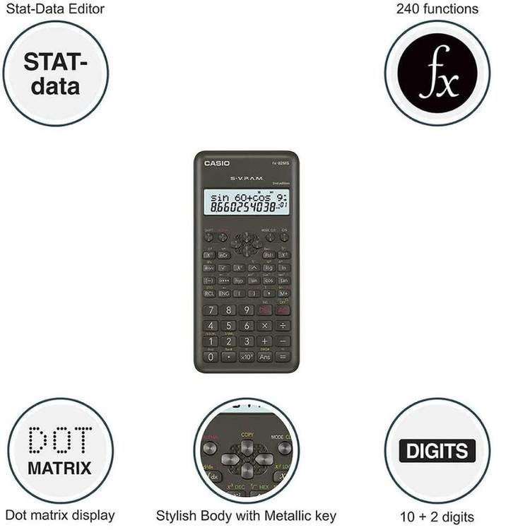 ماشینحساب « fx-82MS 2nd edition» ساخت شرکت کاسیو از مدلهای مهندسی این شرکت است که نسبت به مدلهای سادهتر همین سری مزیتهای خوبی دارد. از این مزیتها میتوان به قابلیت S-V.P.A.M اشاره نمود. در مدلهای قبلی که به فناوری V.P.A.M مجهز هستند عبارات و معادلات همانگونه که در کتب درسی چاپ میشوند نمایش داده میشوند که درک آنها را تسهیل میکند. فناوری S-V.P.A.M تمامی ویژگیهای V.P.A.M را داشته و علاوه بر آن به صفحهنمایشی 2 خطی و قابلیت Replay مجهز است. تمامی این موارد درک ریاضی را آسانتر از قبل میکند. علاوه بر موارد فوق قابلیت STAT-data editor این امکان را به کاربر میدهد تا دادههای واردشده را مرور کرده و در صورت نیاز ویرایش کند. متأسفانه در این مدل خبری از پنل خورشیدی نیست و برق مصرفی دستگاه با استفاده از پنل خورشیدی و جذب نور خورشید و تبدیل آن به برق تأمین میشود که قابلیتی بسیار کاربردی و مفید است و کاربر را باتری بینیاز میکند.