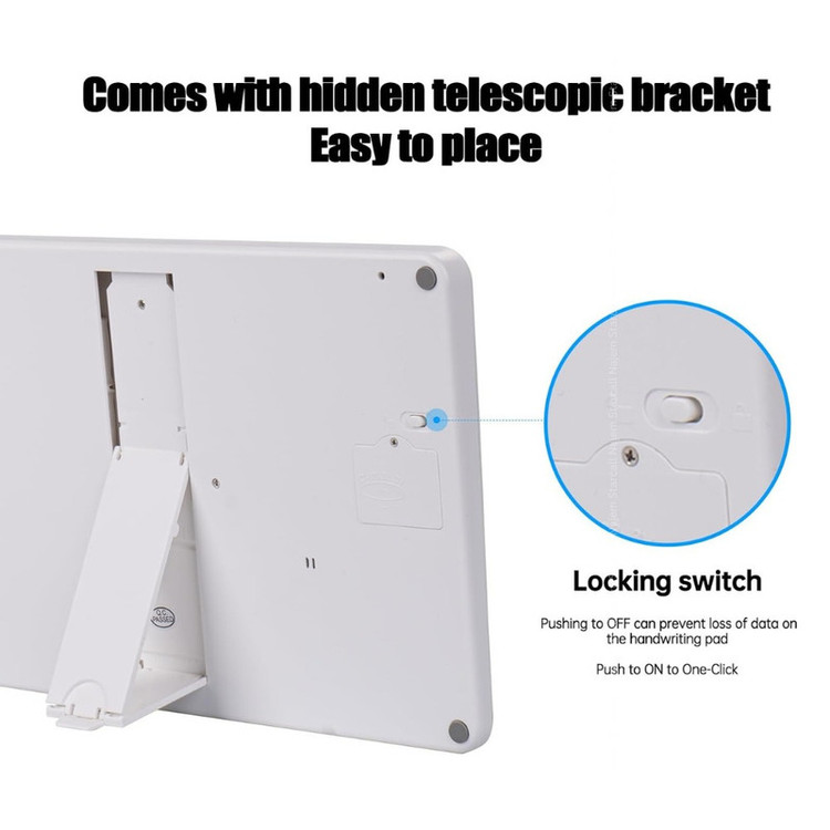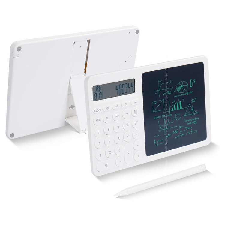 دارای کاغذ دیجیتال به همراه قلم دارای استند به جهت استفاده در حالت ایستاده صفحه نمایش دیجیتال دو خطی با قابلیت نمایش اعداد تا 8 رقم قابلیت نمایش ساعت و دمای محیط